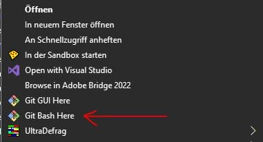 Anschließend könnt ihr auf einer Festplatten-Partition wo genügend Speicherplatz vorhanden ist (~ 20 GB) einen neuen Ordner erstellen. Macht nun einen „rechtsklick“ auf diesen Ordner und wählt „GIT Bash here“ aus. Es wird sich ein Konsolenfenster von GIT öffnen, dass wir benutzen werden um Stable Diffusion zu downoaden.